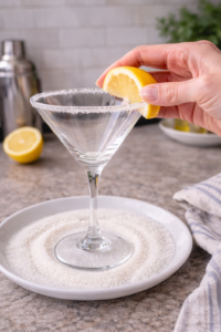 - First, I run a lemon wedge along the rim of a martini glass.