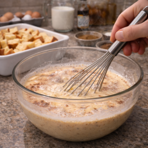 - In a large bowl, I whisk eggs, milk, heavy cream, sugar, vanilla, cinnamon, nutmeg, and salt.