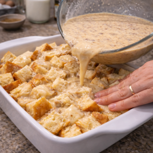 - I pour the custard slowly over the bread cubes.