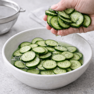 - Toss cucumber slices with salt and let them sit for 10 minutes.