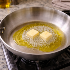 - Heat olive oil and 2 tbsp butter on medium heat.