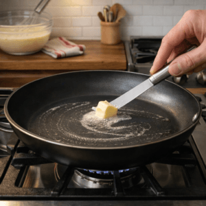 I place a non-stick pan on medium heat and lightly grease it with butter. I let it warm properly before pouring the batter.