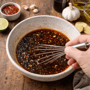 - In a bowl, I whisk together pineapple juice, soy sauce, brown sugar, garlic, ginger, chili sauce, olive oil, lime juice, and pepper. It smells sweet and sharp at the same time — that’s how I know the balance is right.