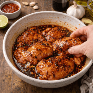 I add the chicken thighs and coat them thoroughly. I let them marinate at least 2 hours in the fridge. Overnight gives deeper flavor, but don’t go beyond 12 hours or the texture changes.