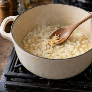 Once it’s melted and slightly bubbly, I add the diced onion. The onions cook for about 4–5 minutes until they become soft and slightly translucent.