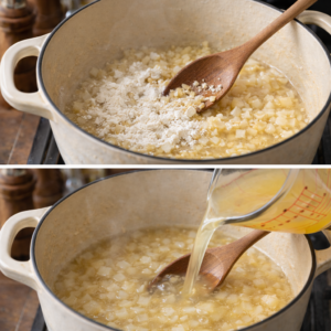 - I sprinkle the flour over the onions and butter while stirring continuously. This creates a light roux that helps thicken the soup later.