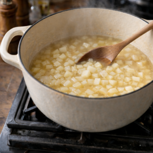 You’ll notice the broth slowly turning thicker as the potatoes release their starch.