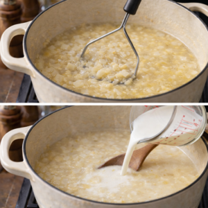 - I use a potato masher to mash about half of the potatoes directly in the pot.
