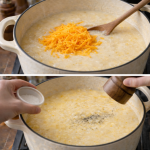 - Once the soup is creamy, I add shredded cheddar cheese.