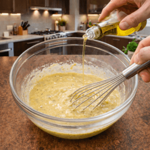 Drizzle gradually the olive oil, and stir continuously. This aids in the emulsification of the dressing and prevents the dressing to separate too fast.