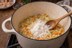 3. This forms a light roux that thickens the soup later.