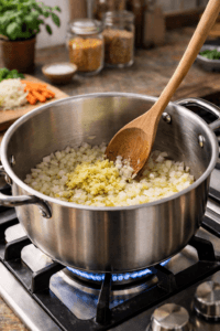 Add chopped onion and cook for 3–4 minutes until soft.Then add garlic and ginger. Cook for 1 minute until fragrant.