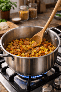 - Add chopped onion and cook for 3–4 minutes until soft.