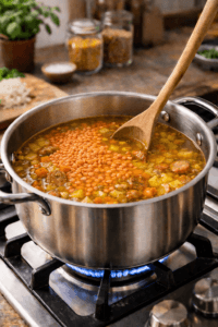 Lower the heat and let it cook for 25–30 minutes until lentils are soft.