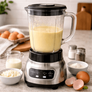 - Add eggs, cream, cottage cheese, salt, and pepper into a blender.