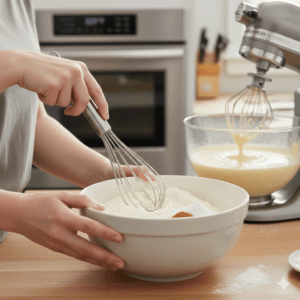- In a separate bowl, mix flour, baking powder, and salt.
