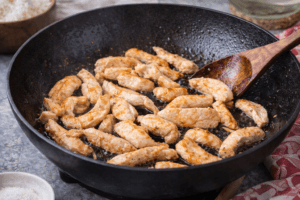 - Heat oil in a wok on medium-high heat. Add chicken strips and cook for 4–5 minutes until fully cooked. Remove and set aside.