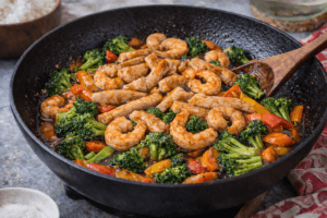 It’s a stir fry made with three proteins, usually chicken and shrimp, cooked with vegetables in savory sauce.