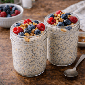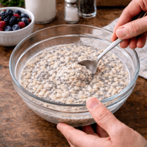 This recipe is a creamy blend of chia seeds and oats soaked in milk until thick and pudding-like. It’s inspired by smoothie café breakfast bowls but made with simple pantry ingredients.
