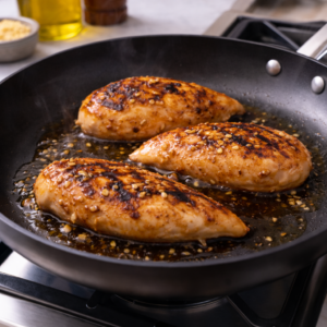 I place the chicken pieces into the hot pan and cook for about 6–7 minutes per side.