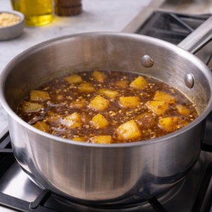 - In a small saucepan, I pour the leftover marinade along with pineapple chunks.